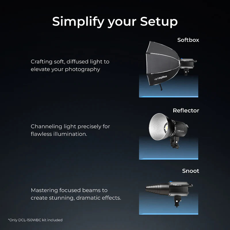 Featuring a high CRI of 95, the light ensures accurate color reproduction, maintaining natural skin tones and true-to-life visuals. Whether you're capturing products or shooting cinematic content, the DCL-150WBC ensures that every detail is illuminated with clarity and accuracy.