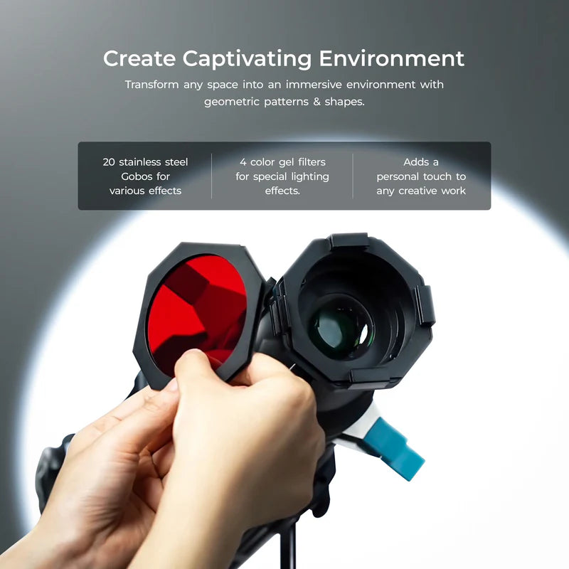 The highlight of this kit is the 20 stainless steel GOBOs—durable, heat-resistant templates that project shapes such as windows, grids, patterns, florals, abstract designs, and more. These GOBOs add depth and creativity to your setup, allowing you to craft unique lighting backdrops or foreground effects entirely in-camera.