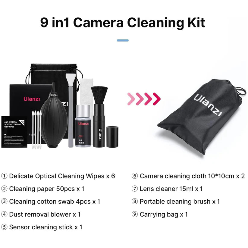 The HIFFIN ULANZI Camera Cleaning Kit 9-in-1 is a complete and professional cleaning solution designed to keep your camera gear in pristine condition. Ideal for photographers, videographers, and content creators, this all-in-one kit helps maintain optimal image quality by safely removing dust, fingerprints, smudges, and debris from camera lenses, sensors, filters, and screens.
