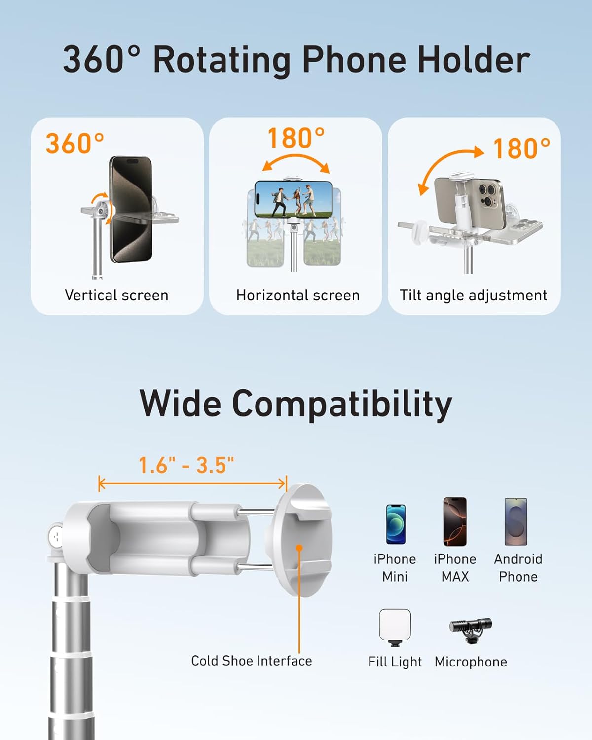 The extendable 70-inch aluminum body allows you to capture dynamic perspectives, from wide group photos to overhead or low-angle videos. Its 360° adjustable head enables you to switch easily between portrait and landscape orientations for perfect framing in any scene.