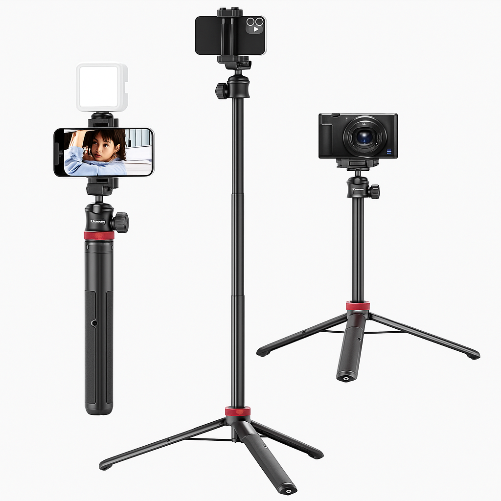 Designed for creators on the go, this tripod is made from high-quality aluminum alloy that provides durability while remaining lightweight. Its extendable length allows you to adjust height easily for multiple shooting scenarios from tabletop recordings to outdoor vlogs. Whether you are capturing wide-angle group shots, recording interviews, or streaming live sessions, the MT-44 gives you the flexibility to get the perfect angle.